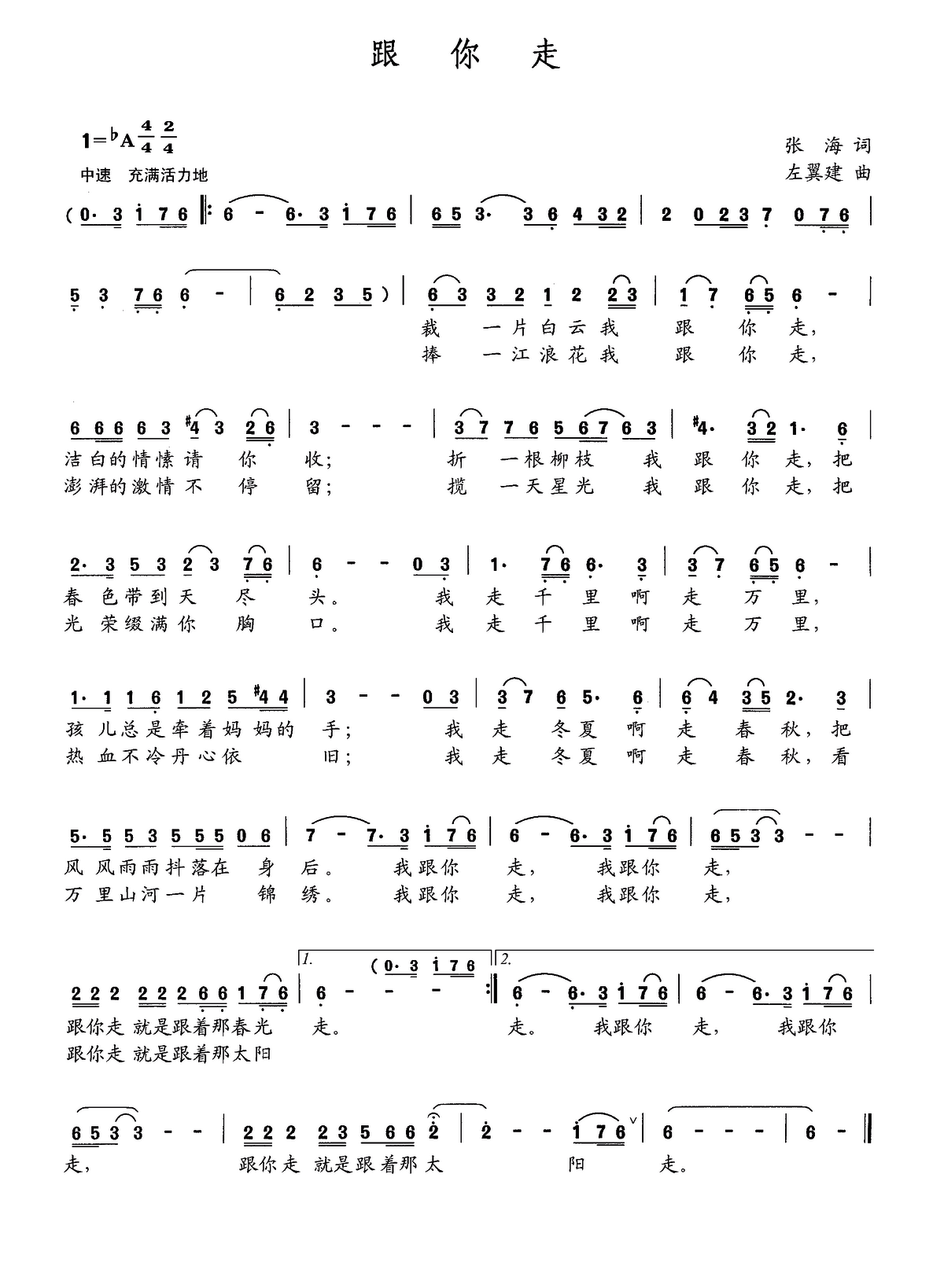 当前位置: 首页简谱正文 本页是跟你走简谱,由魏松演唱,bA调编配,节奏4/4拍,《跟你走》共有3张图片谱,本简谱由曲谱热更新上传,编配制谱不详。 跟你走简谱(1) 声明:本站所有文章,如无特殊说明或标注,均为本站原创发布。任何个人或组织,在未征得本站同意时,禁止复制、盗用、采集、发布本站内容到任何网站、书籍等各类媒体平台。如若本站内容侵犯了原著者的合法权益,可联系我们进行处理。 收藏 海报 链接