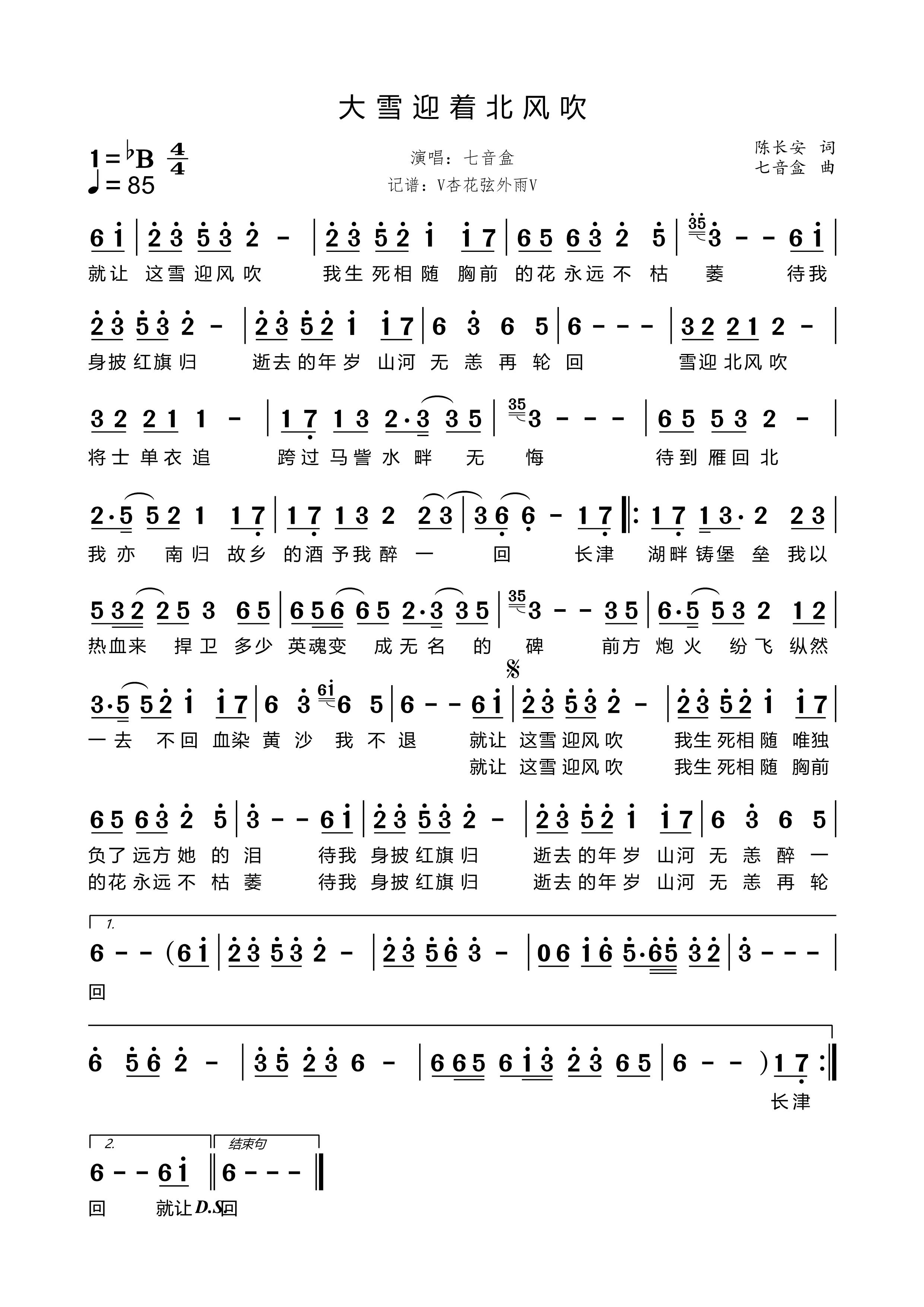 本页是大雪迎着北风吹简谱,是七音盒的一首歌曲所改编,4/4拍的节奏,速度85,bB调版,由曲谱热更新上传,共1张高清图片简谱例,来源于网络转载,杏花弦外雨编配制谱,曲谱热更新上传。