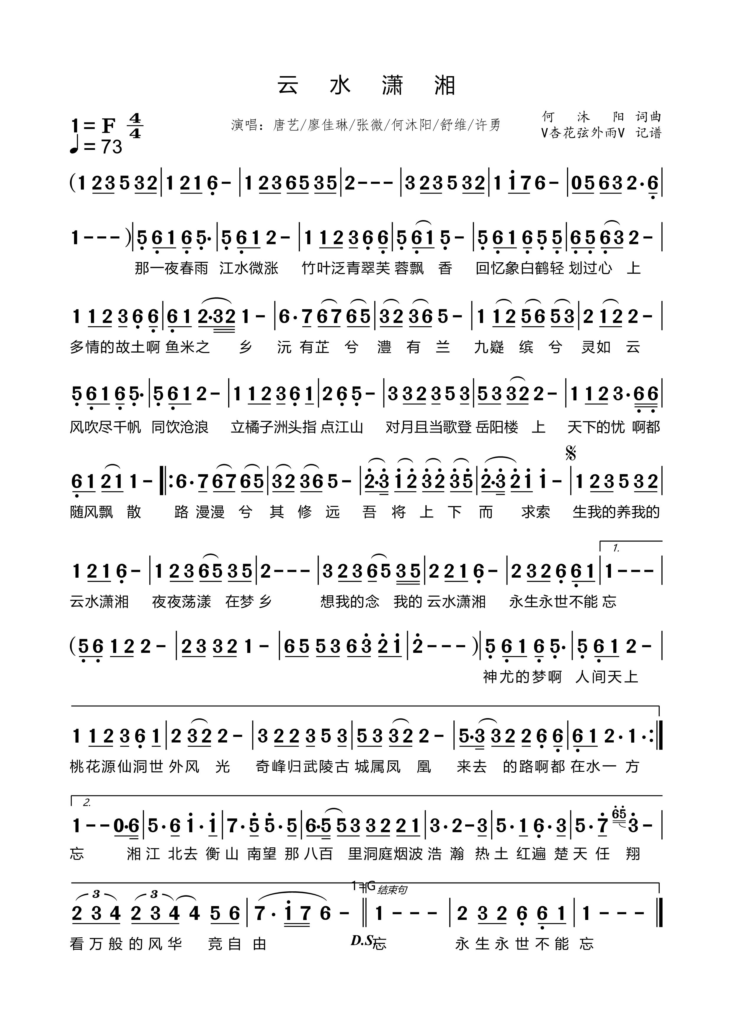 本页是云水潇湘简谱,是唐艺/廖佳琳等演唱的一首歌曲所改编,4/4拍的节奏,速度73,F调版,由曲谱热更新上传,共1张高清图片简谱例,来源于网络转载,杏花弦外雨编配制谱,曲谱热更新上传。