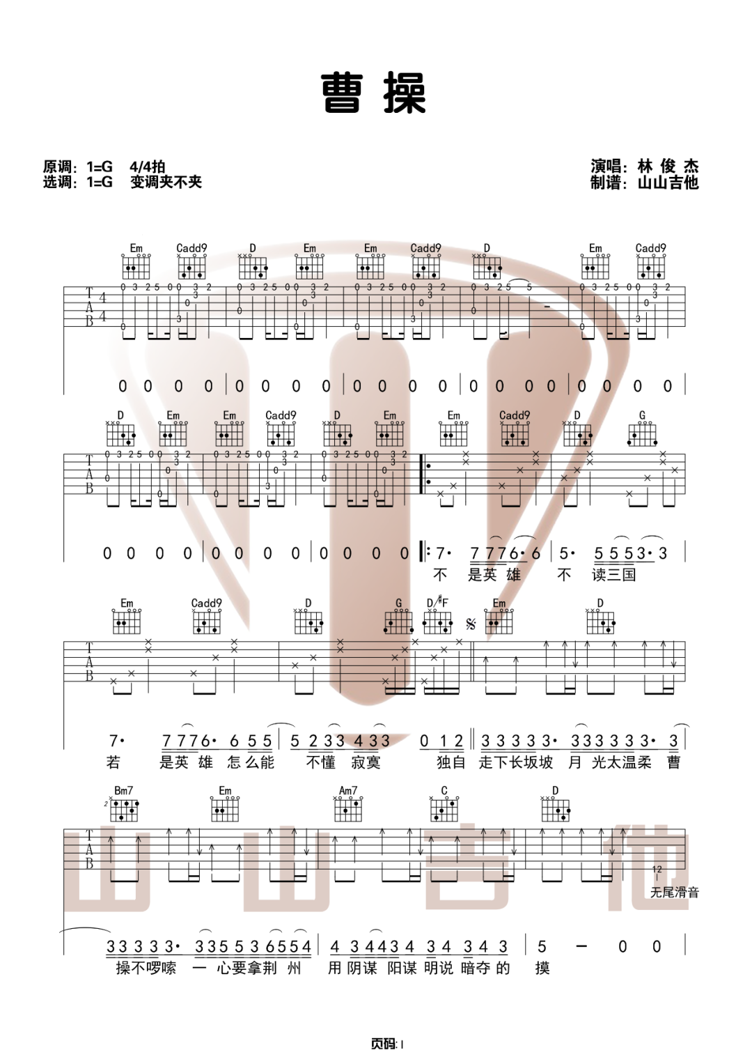 本页是曹操吉他谱,由林俊杰演唱,共有3页高清图,选用G调,节奏4/4拍,无需变调夹。