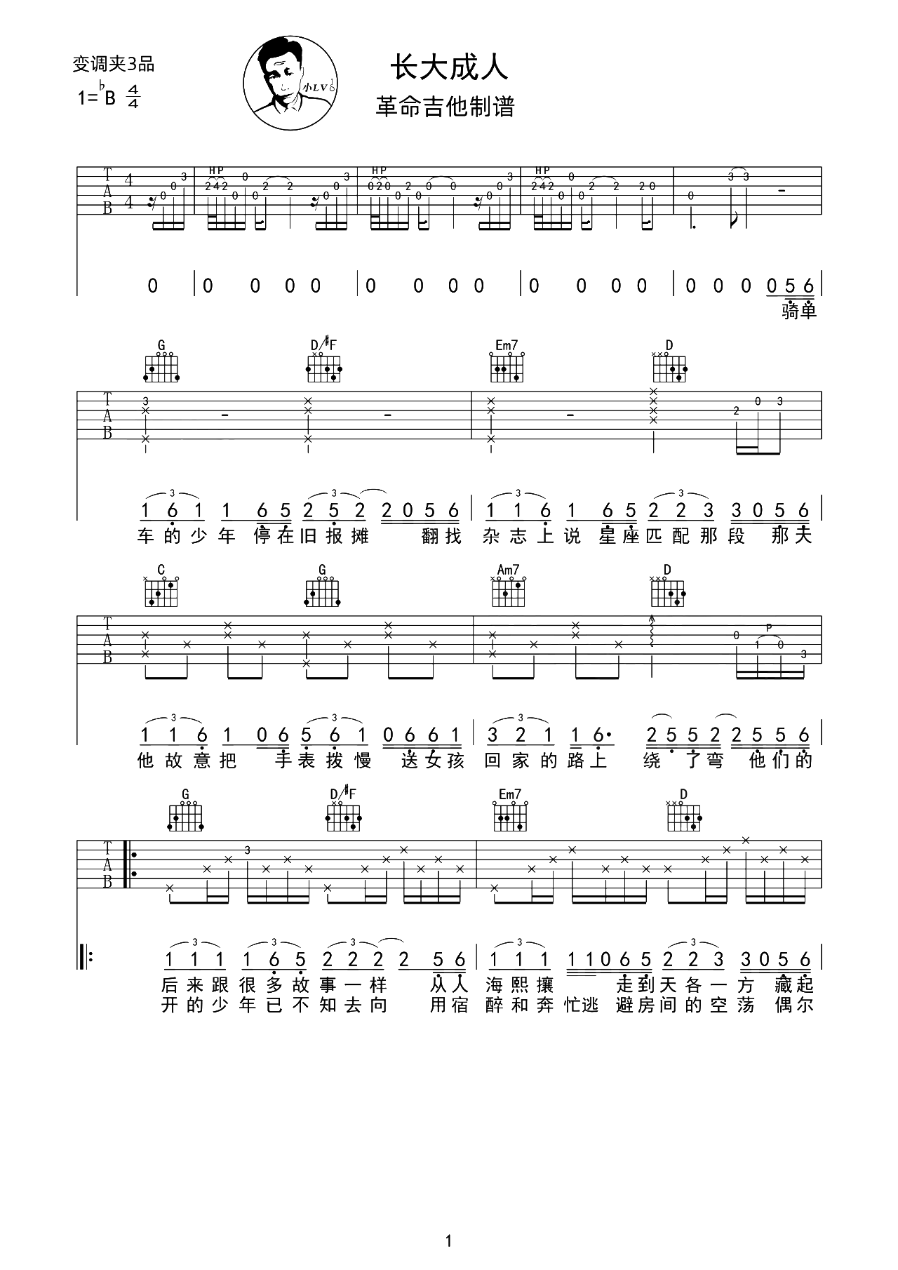 本页是长大成人吉他谱,由范茹演唱,共有3页高清图,选用G调,节奏4/4拍,变调夹夹3品弹回原调。