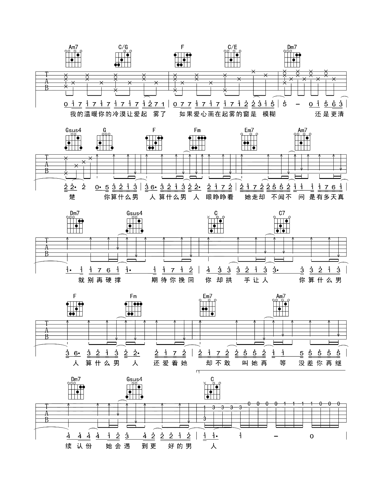 本页是算什么男人吉他谱,由周杰伦演唱,共有3页高清图,选用C调,节奏4/4拍,速度52BPM,变调夹夹1品弹唱原调。