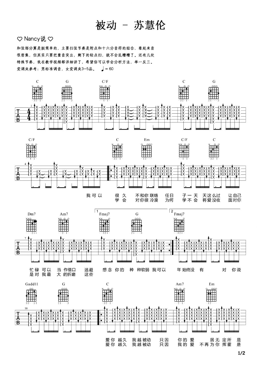 本页是被动吉他谱,由苏慧伦演唱,共有2页高清图,速度60BPM,节奏4/4拍,男生无需变调夹,女生3-5品。