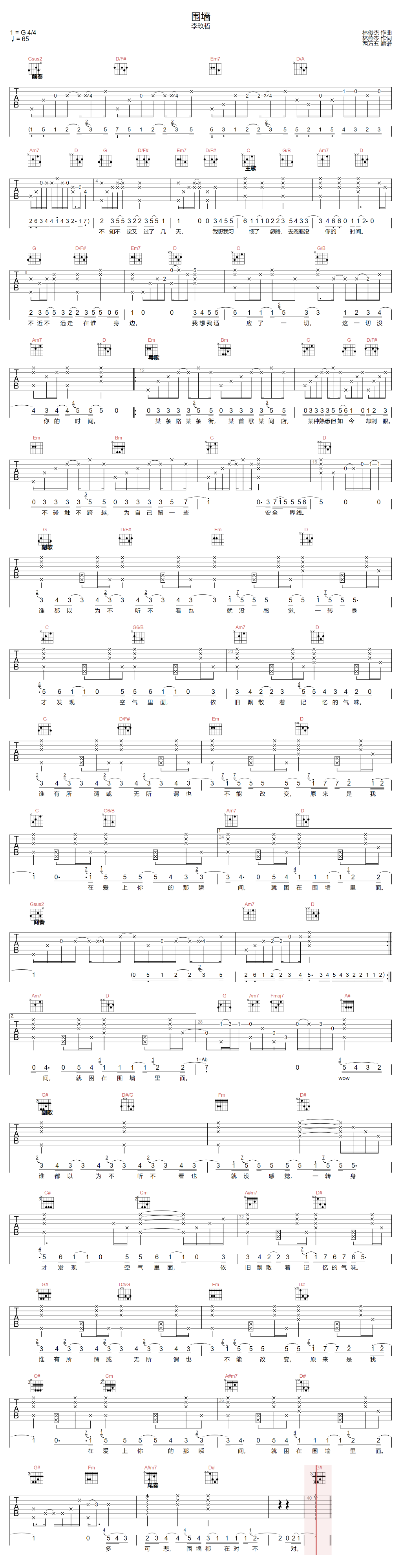 本页是围墙吉他谱,由李玖哲演唱,共有1页高清图,选用G调,节奏4/4拍,速度65BPM,无需使用变调夹。
