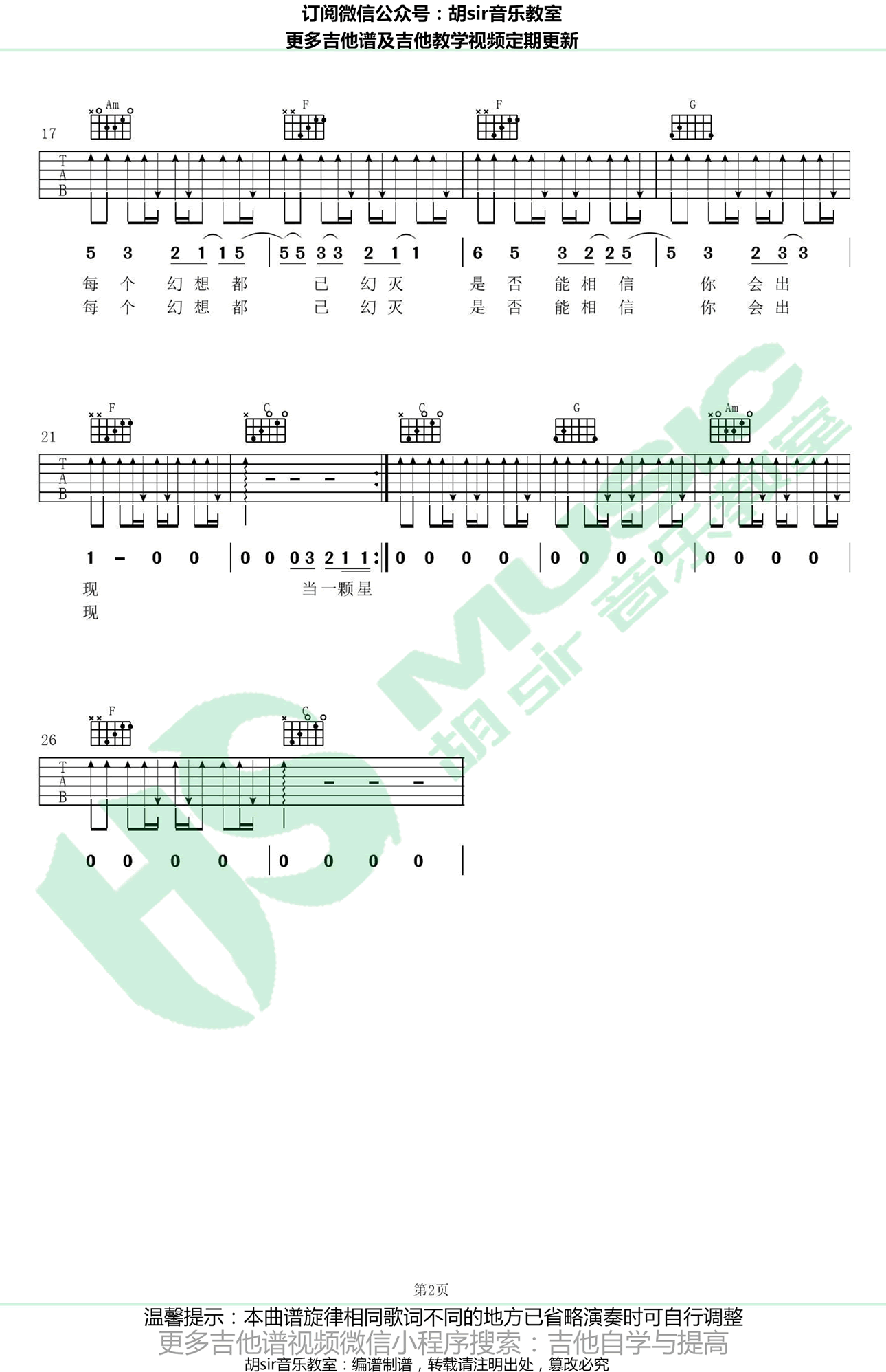 本页是当每颗星星吉他谱,由阿信演唱,共有2页高清图谱,选用C调,节奏4/4拍,无需使用变调夹。