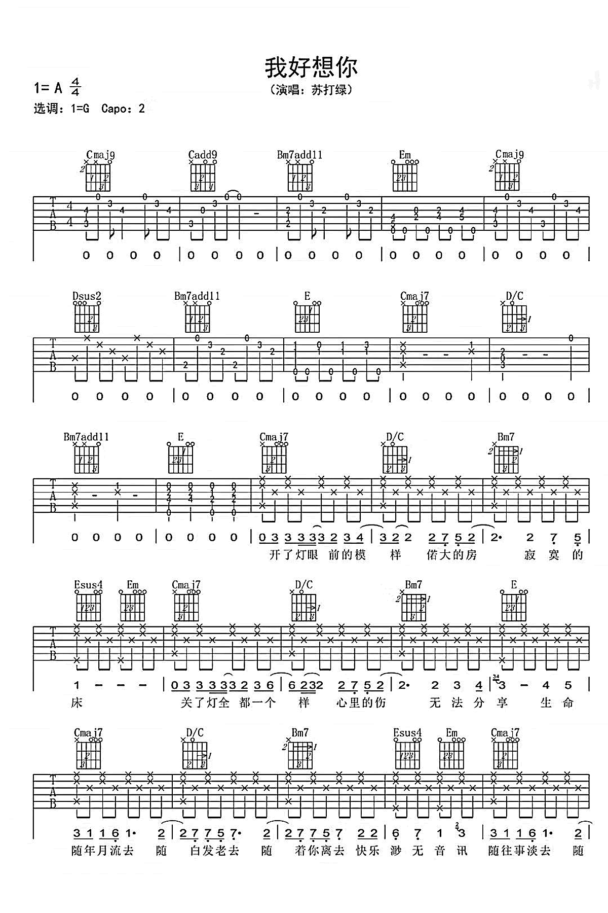本页是我好想你吉他谱,由苏打绿演唱,共有2页高清图谱,选用G调,节奏4/4拍,变调夹夹2品弹唱原调。