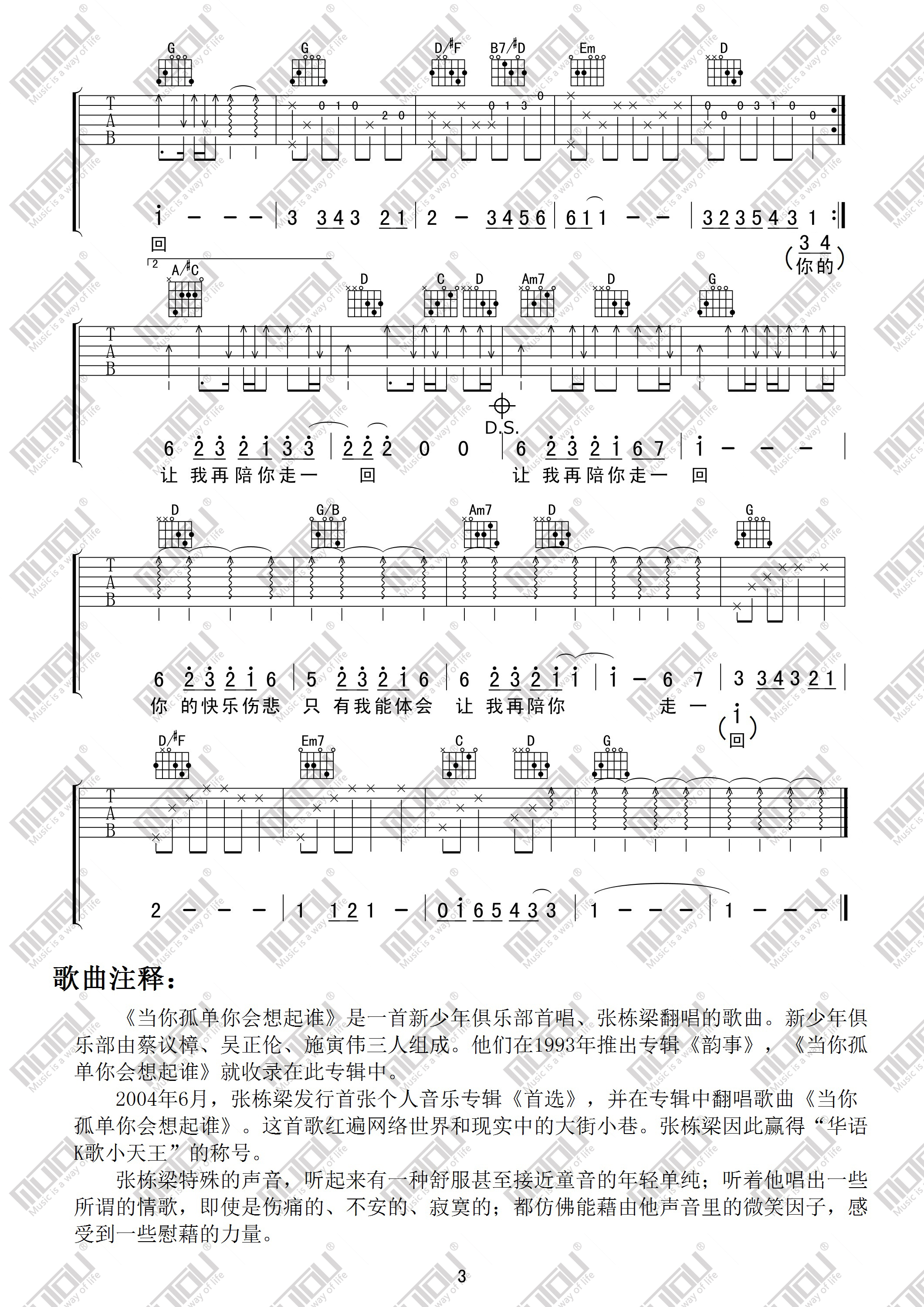 本页是当你孤单你会想起谁吉他谱,由张栋梁演唱,共有3页高清图谱,选用G调,节奏4/4拍,变调夹夹4品弹唱原调。