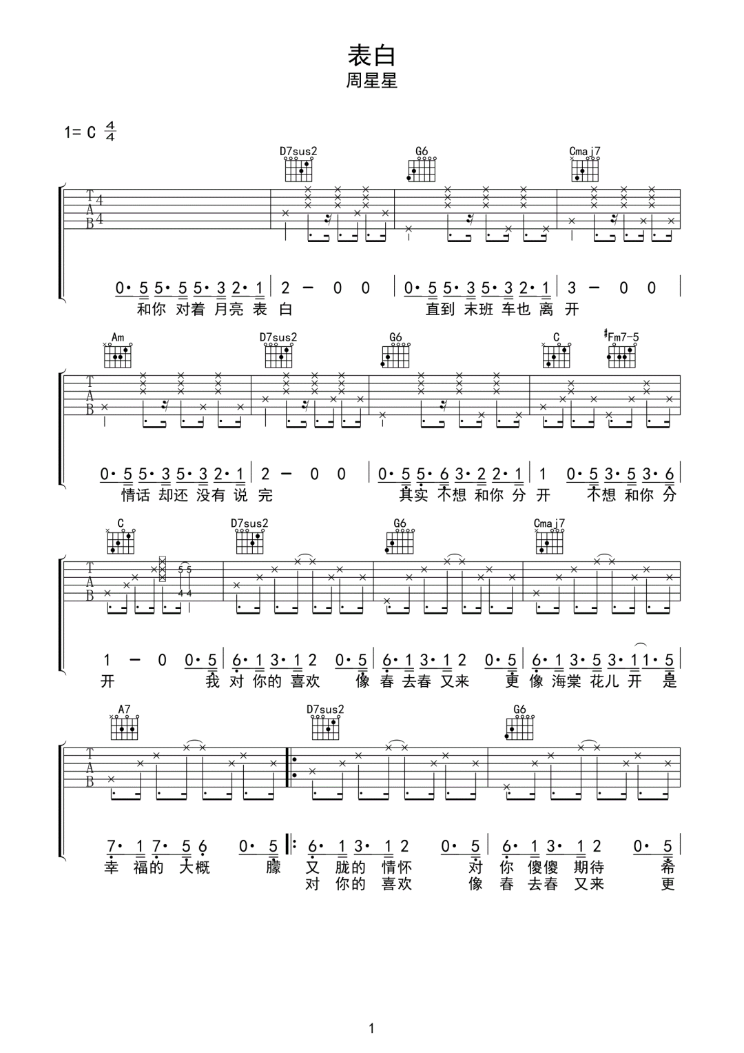 本页是表白吉他谱,由周星星演唱,共有3页高清图谱,选用C调,节奏4/4拍,无需使用变调夹。