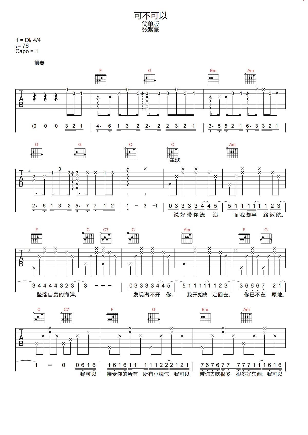 本页是可不可以吉他谱,由张紫豪演唱,共有四页高清图谱,选用C调,节奏4/4拍,速度76BPM,变调夹夹1品弹唱原调。