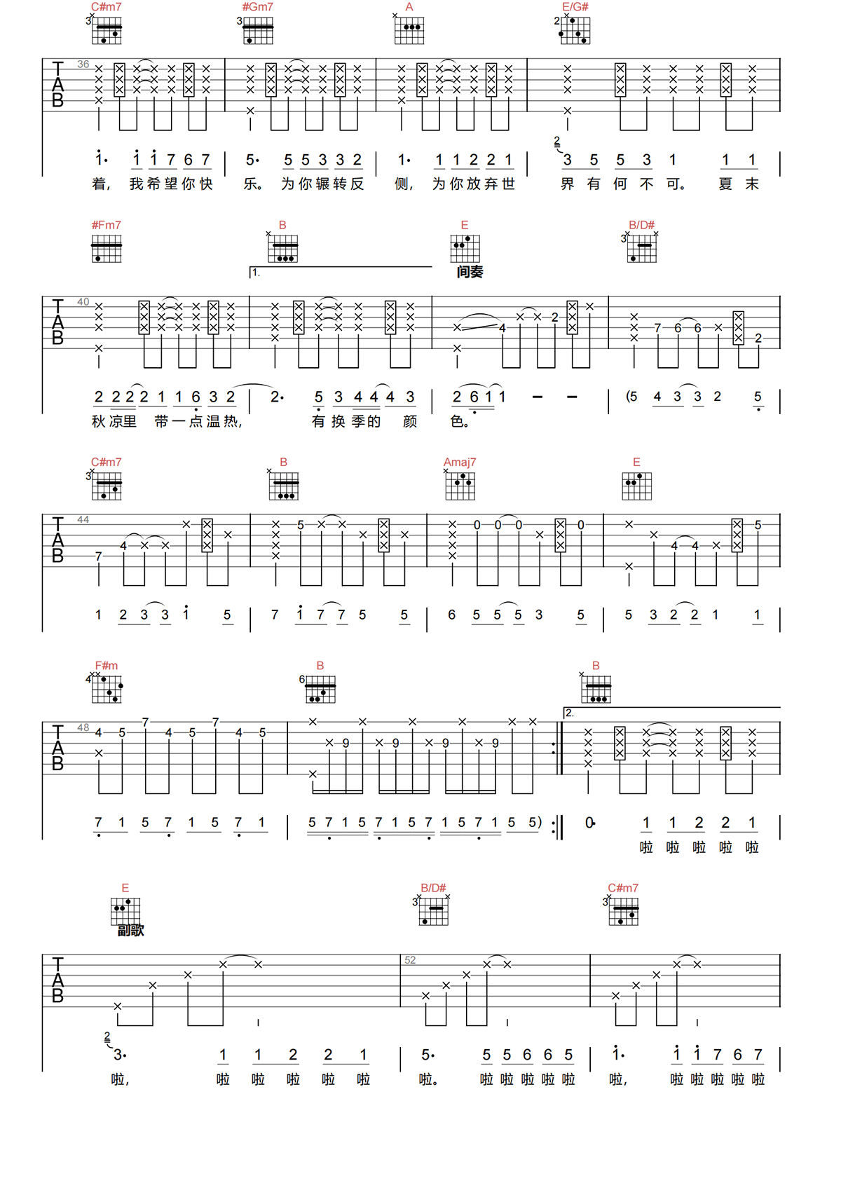 本页是有何不可吉他谱,由许嵩演唱,选用E调指法,变调夹夹2品弹唱原调,速度100拍每分钟,节奏4/4拍,共有4页高清图谱。