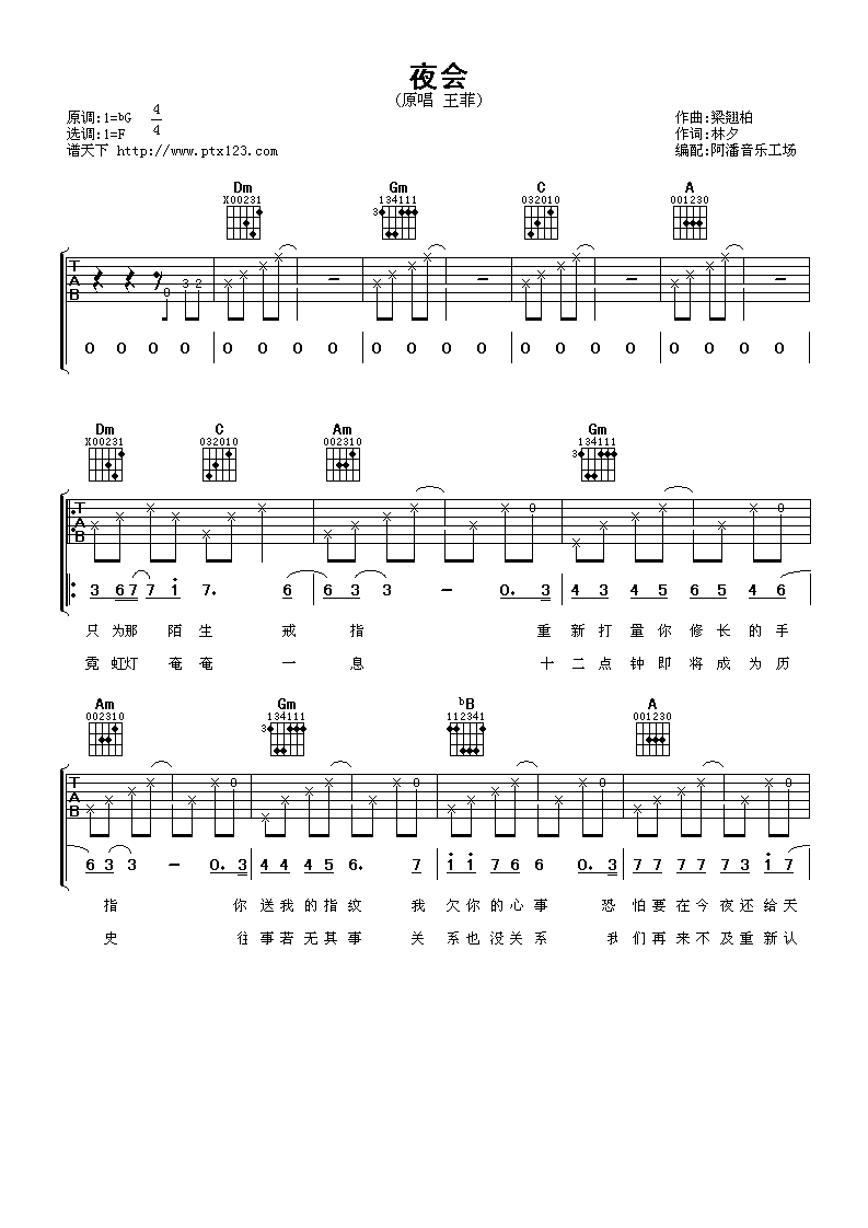 本页是夜会吉他谱,共有三张高清图谱,采用F调指法,由王菲演唱。