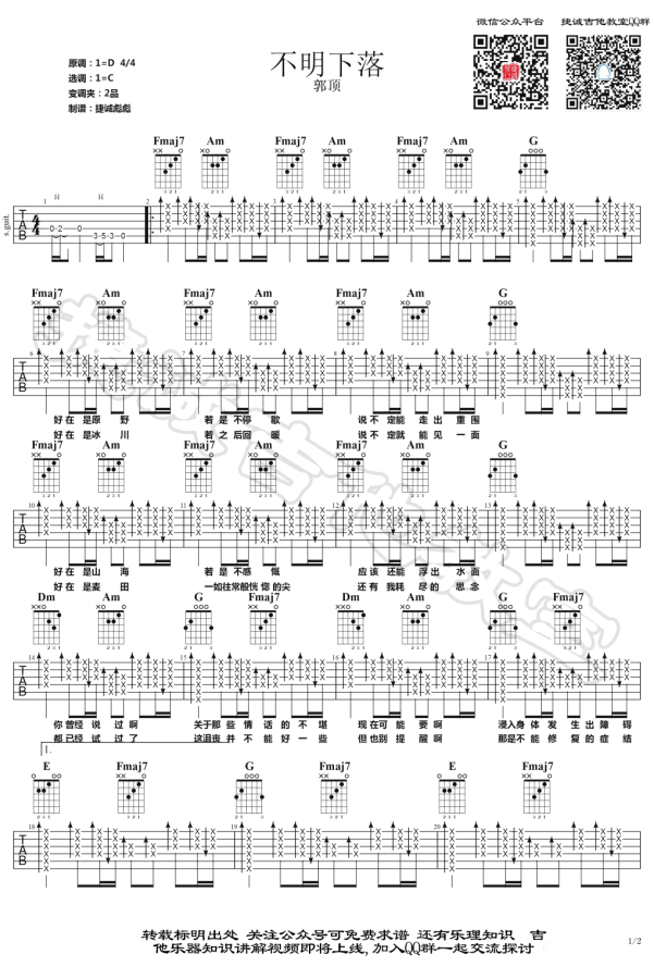 本页是不明下落吉他谱,由郭顶演唱,共有2页高清图谱,选用C调,节奏4/4拍,变调夹夹2品弹唱原调。