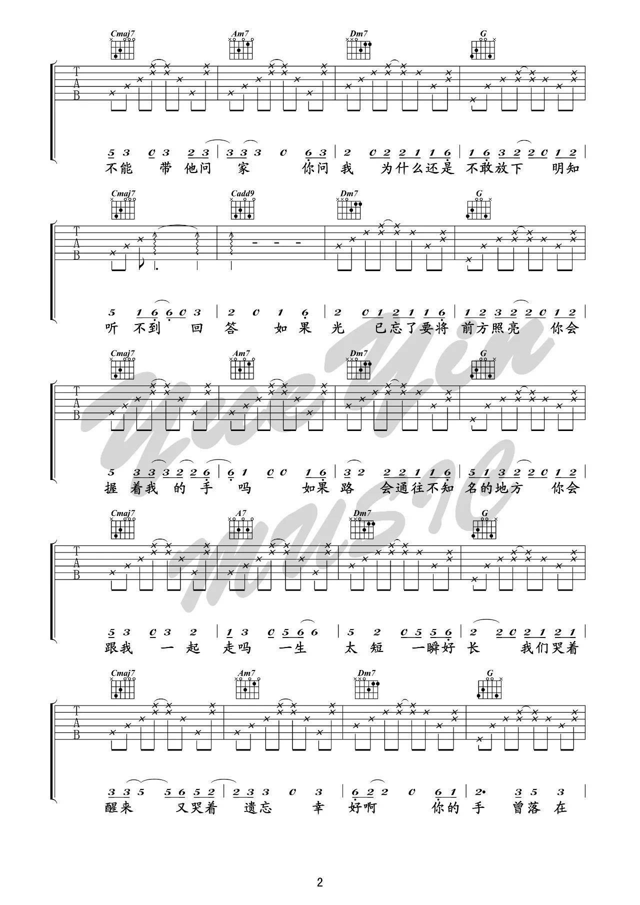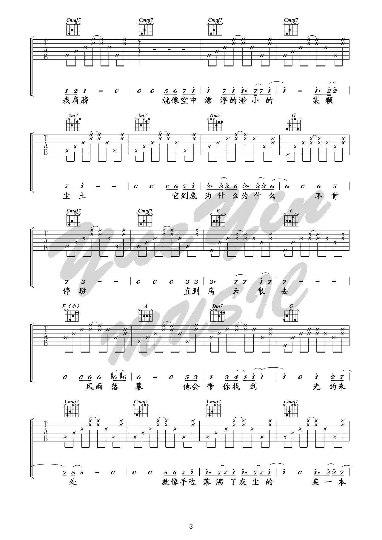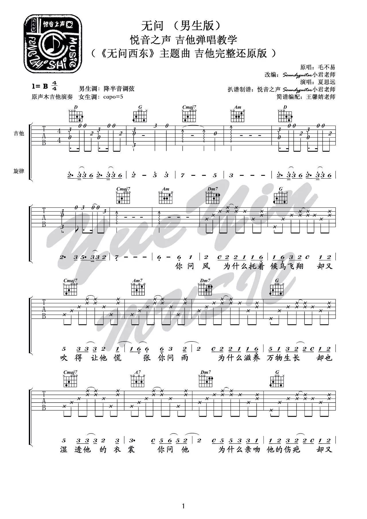 本页是无问吉他谱,由毛不易演唱,共有6页高清图谱,选用C调,节奏4/4拍,降半音调弦弹唱原调。