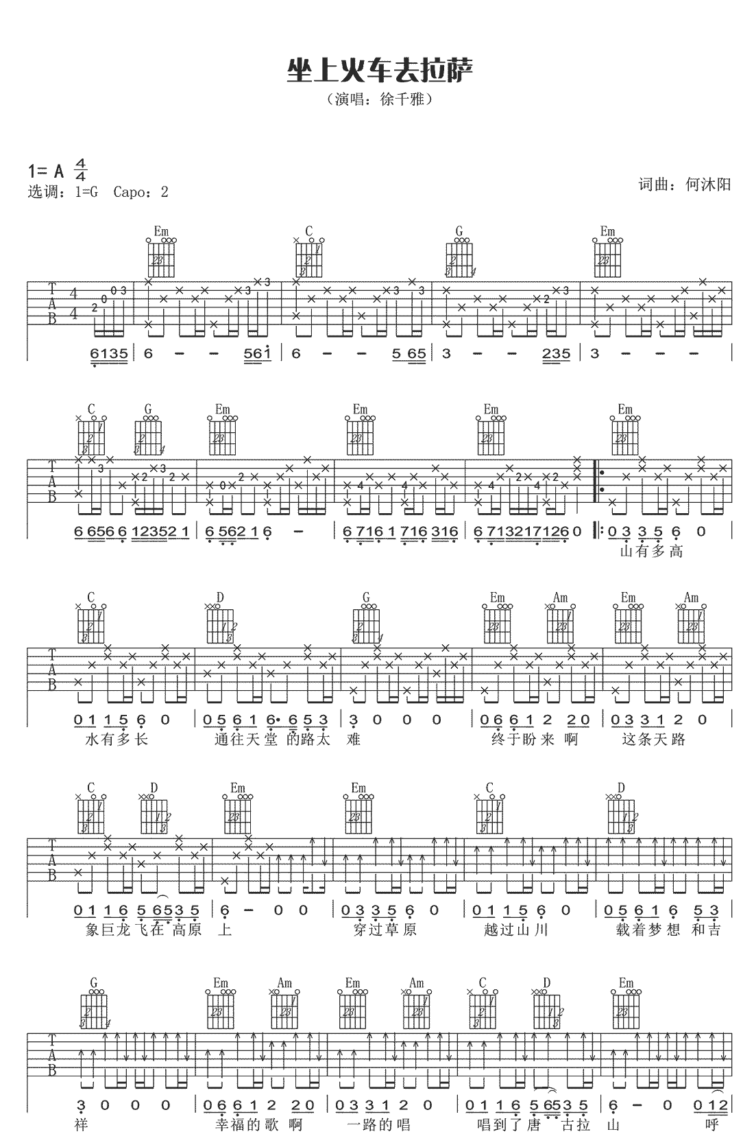 本页是坐上火车去拉萨吉他谱,由徐千雅演唱,共有2页高清图谱,选用G调,节奏4/4拍,变调夹夹2品弹唱原调。