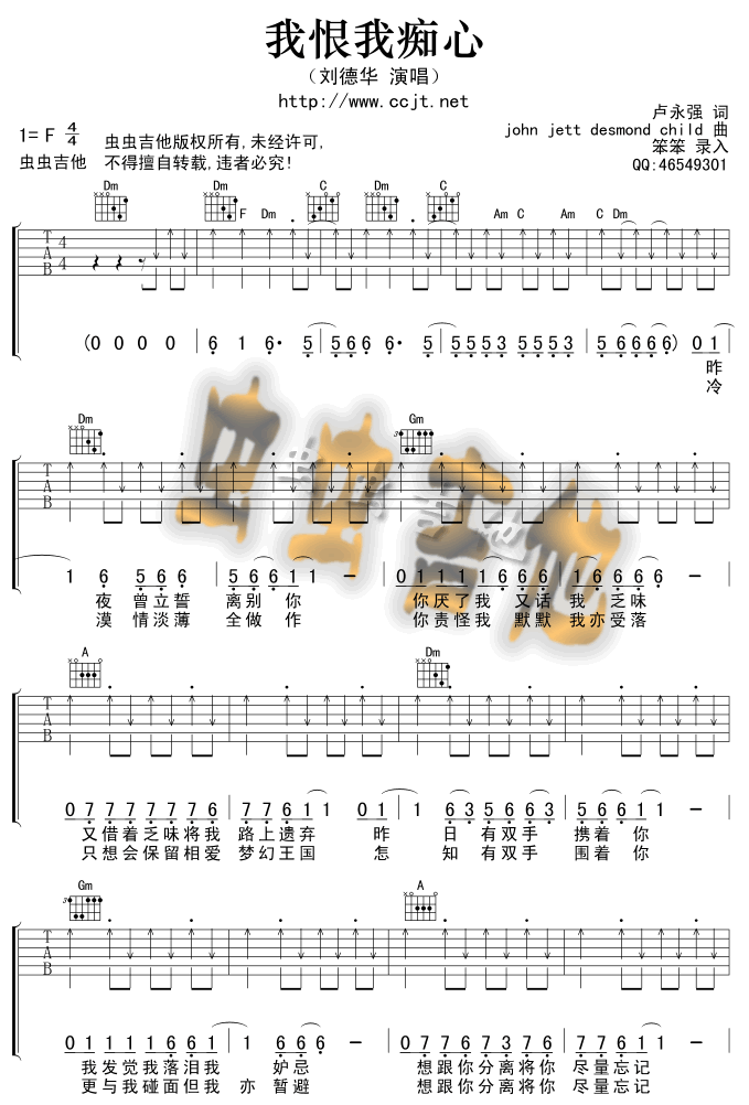 本页是我恨我痴心吉他谱,由刘德华演唱,共有四页高清图谱,选用F调,节奏4/4拍,无需使用变调夹。