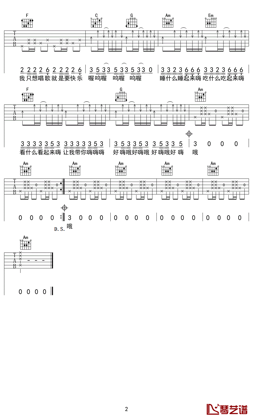 本页是好嗨哦吉他谱,由陈豆豆演唱,共有2页高清图谱,选用C调,节奏4/4拍,变调夹夹3品弹唱原调。