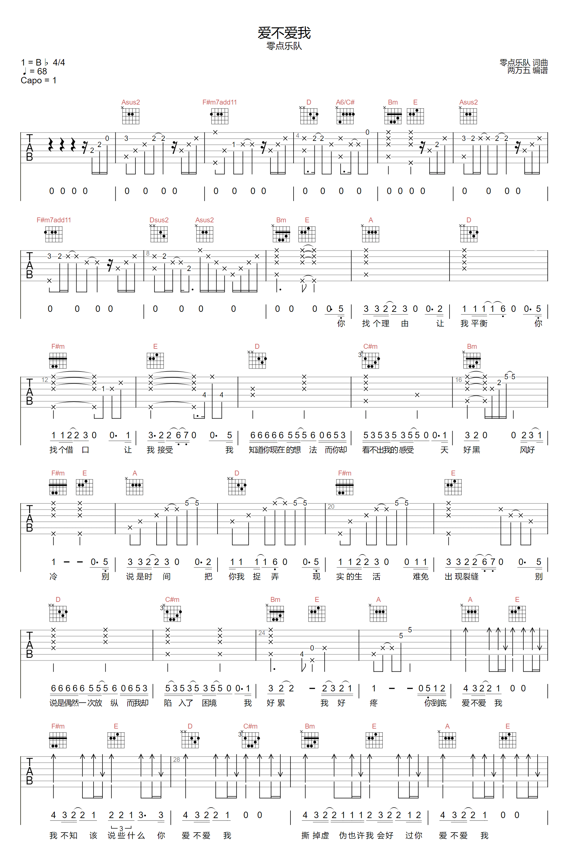 本页是爱不爱我吉他谱,由零点乐队演唱,共有3页高清图谱,选用G调,节奏4/4拍,速度68BPM,变调夹夹1品弹唱。