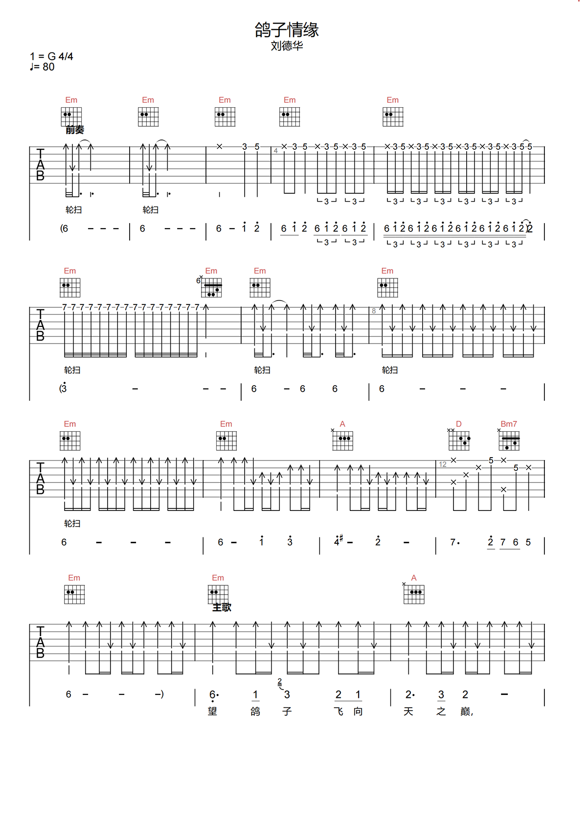 本页是鸽子情缘吉他谱,由刘德华演唱,共有4页高清图谱,选用G调,节奏4/4拍,速度80BPM,无需使用变调夹。