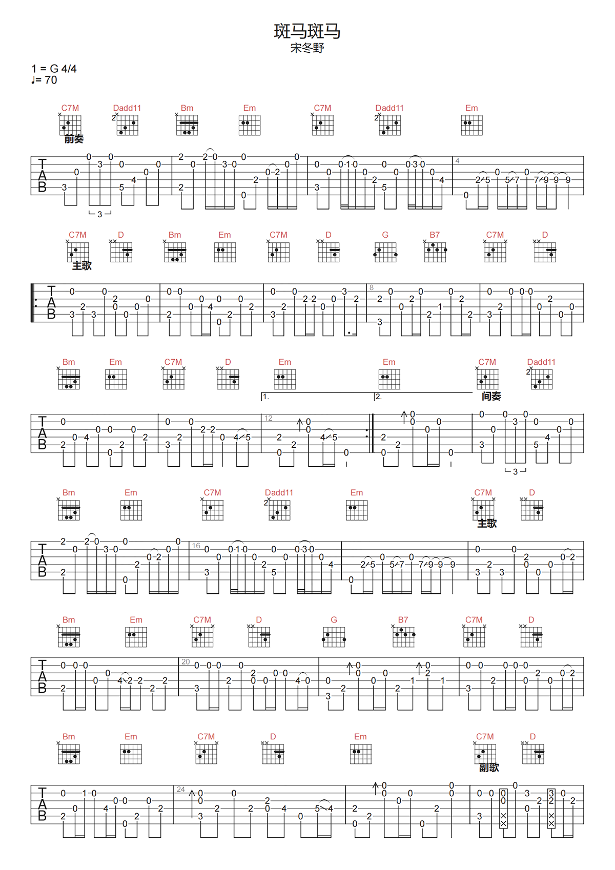 本页是斑马斑马吉他谱,由宋冬野演唱,共有3页曲谱,选用G调,节奏4/4拍,速度70BPM,无需使用变调夹。