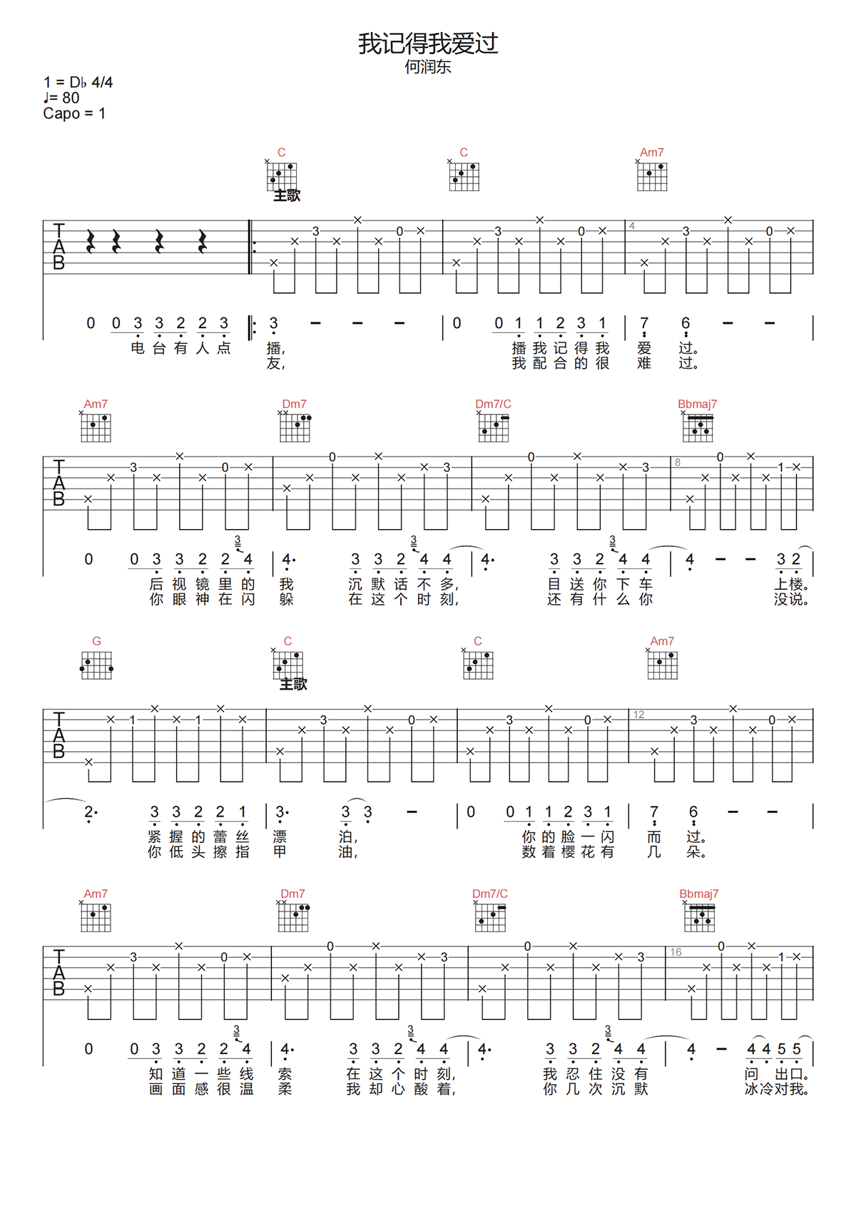 本页是我记得我爱过吉他谱,由何润东演唱,共有4页曲谱,选用C调,节奏6/8拍,速度80BPM,变调夹夹1品弹唱原调。