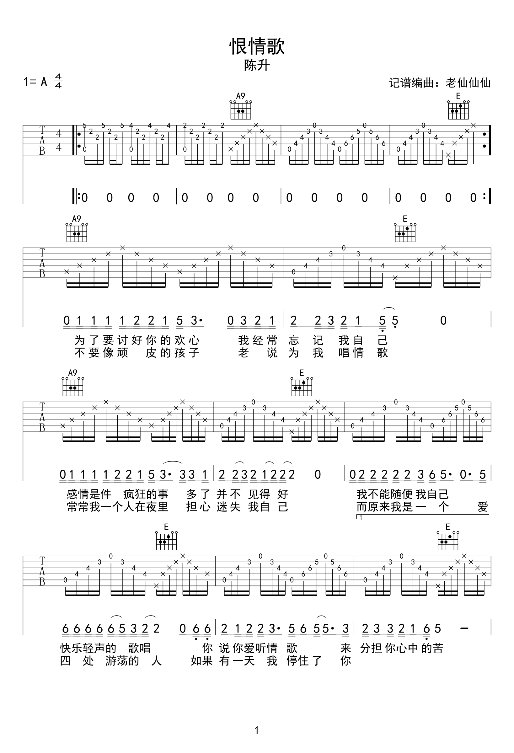 本页是恨情歌吉他谱,由陈升演唱,共有3页高清图谱,选用C调,节奏4/4拍,无需使用变调夹。