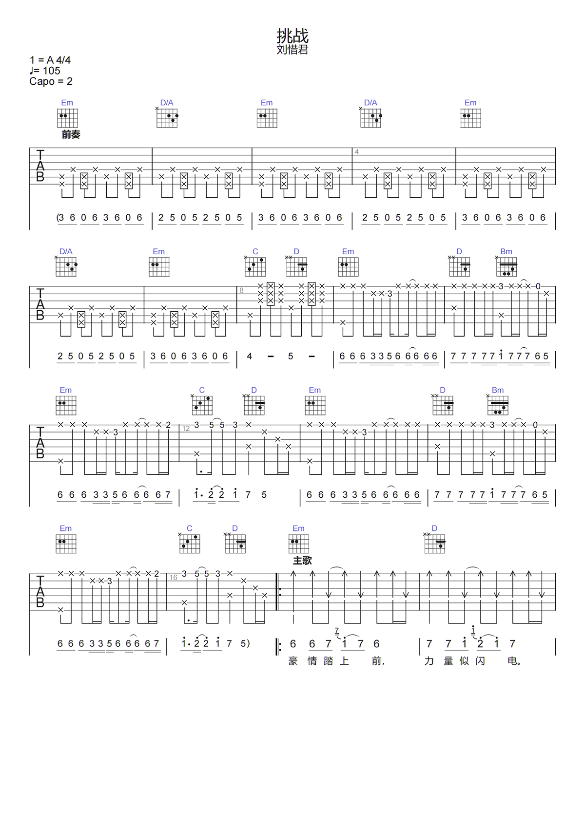 本页是挑战吉他谱,由刘惜君演唱,共有7页曲谱,选用G调,节奏4/4拍,速度105BPM,变调夹夹在第二品可以弹唱原调。