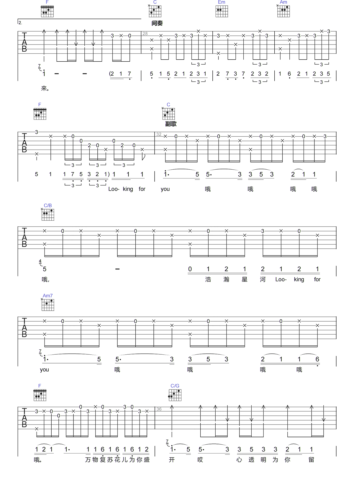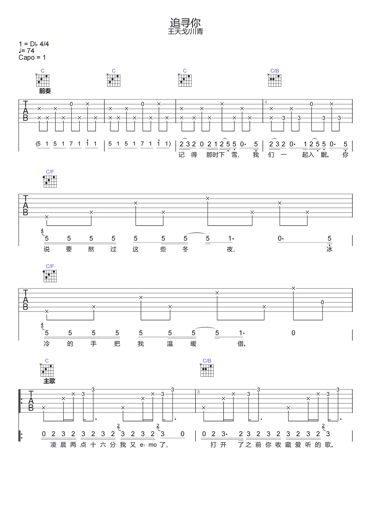 本页是追寻你吉他谱,由王天戈和川青演唱,共5页,选用C调,节奏4/4拍,速度74BPM,变调夹夹1品弹唱原调。