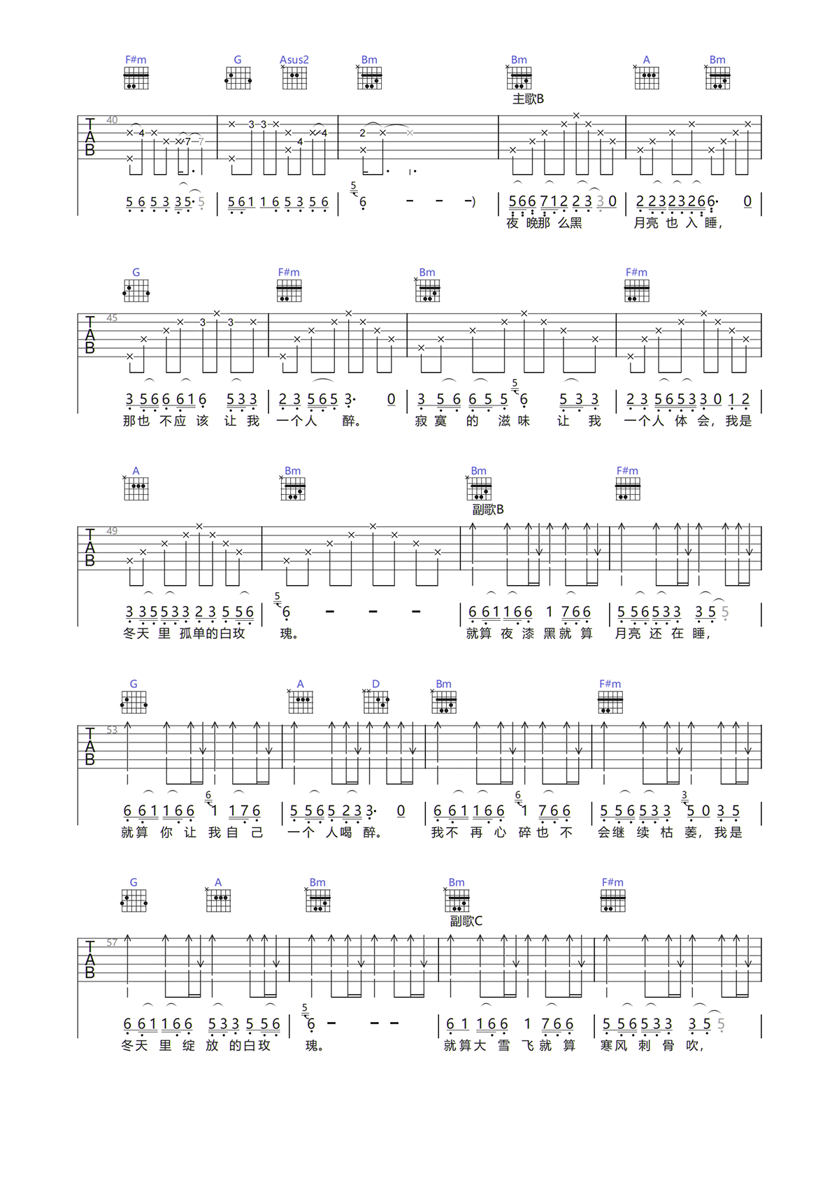 本页是冬天里的白玫瑰吉他谱,由地铁兄弟演唱,共有4页,选用D调,节奏4/4拍,速度80BPM,变调夹夹4品弹唱原调。