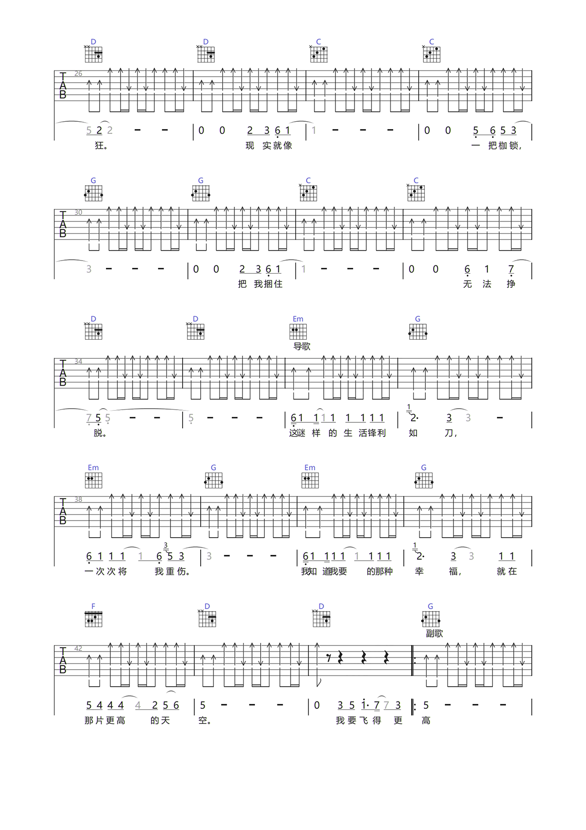 本页是飞得更高吉他谱,由汪峰演唱,共有6页,选用G调,节奏4/4拍,速度96BPM,变调夹夹2品弹唱原调。