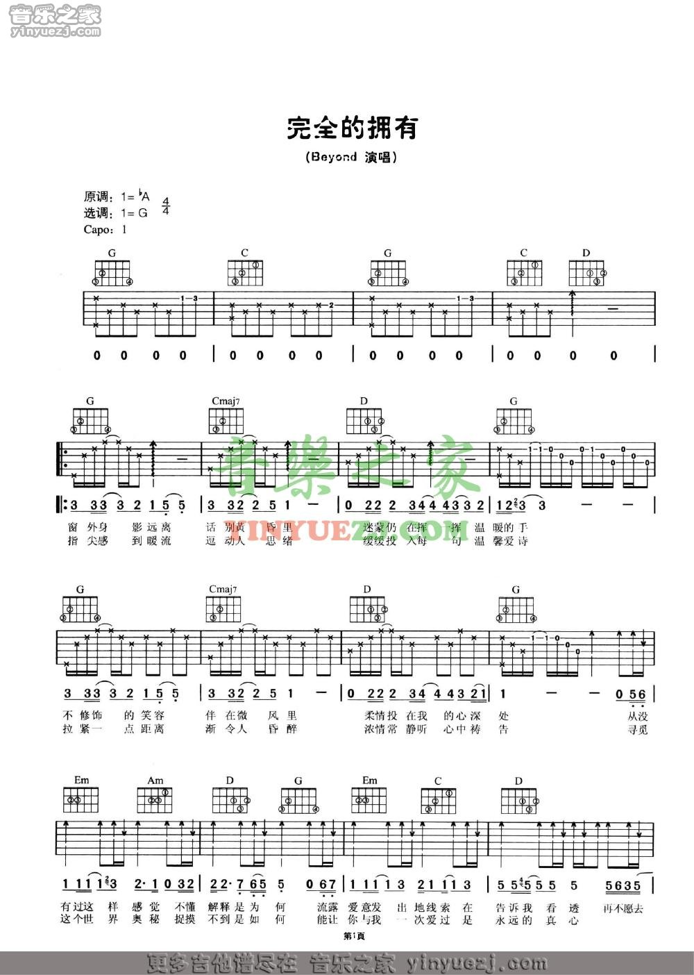 本页是完全的拥有吉他谱,由BEYOND演唱,共有3页高清图谱,选用G调,节奏4/4拍,无需使用变调夹.