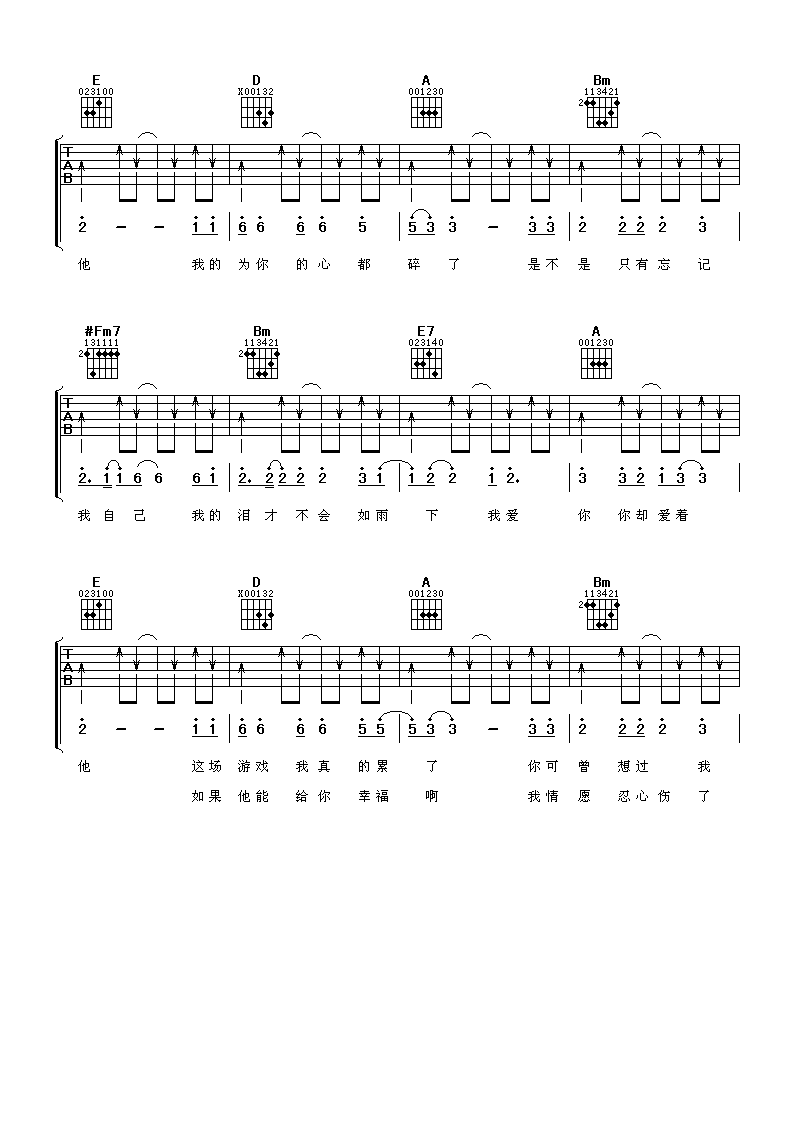 本页是我爱你你却爱着他吉他谱,由黑龙演唱,共有5页高清图谱,选用A调,节奏4/4拍,变调夹夹1品弹回原调。