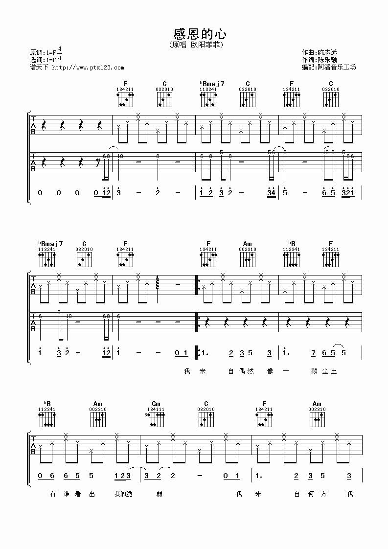 本页是感恩的心吉他谱,由欧阳菲菲演唱,共有3页高清图谱,选用F调,节奏4/4拍,无需使用变调夹。