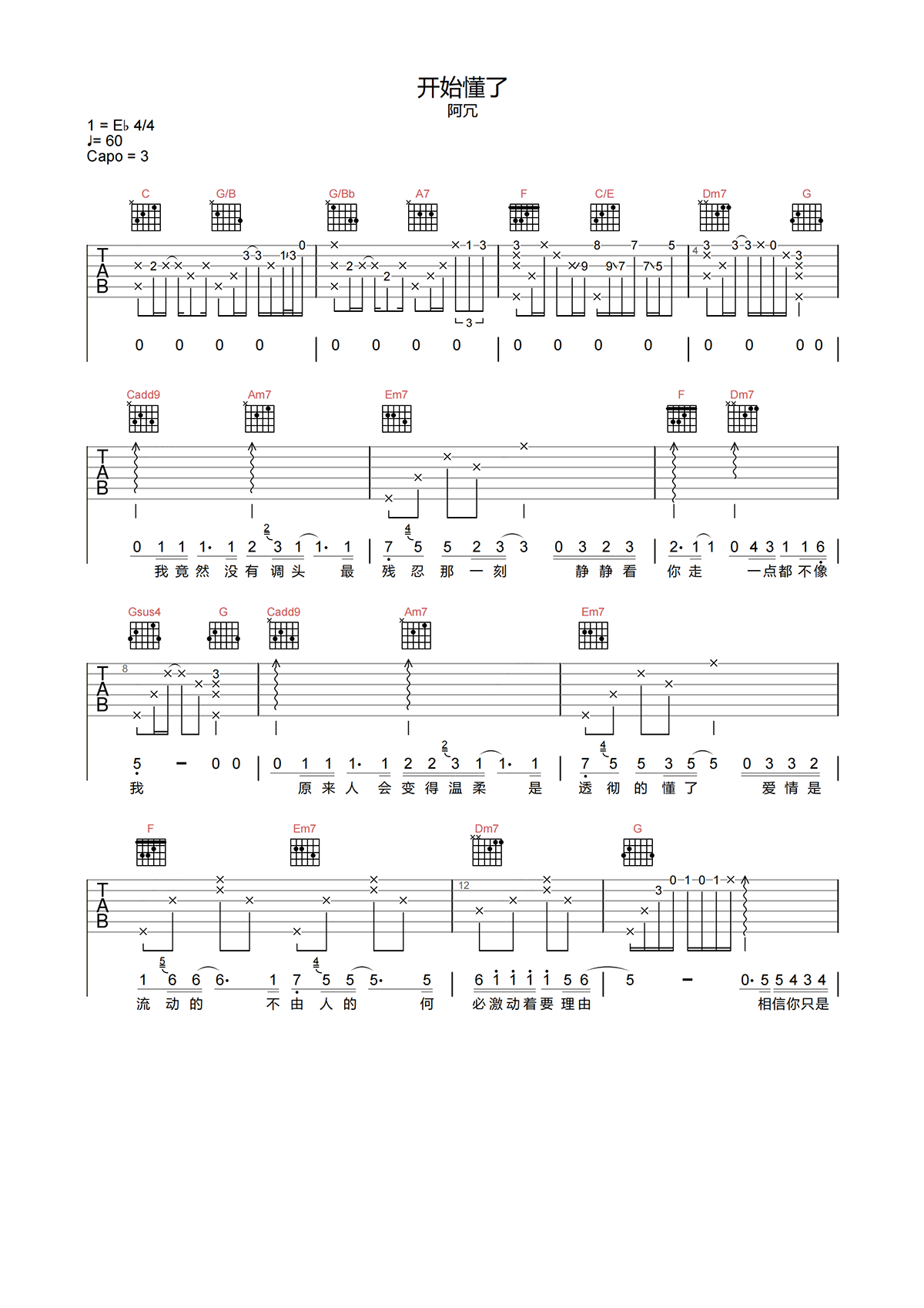 本页是开始懂了吉他谱,由阿冗演唱,共有5页高清图,选用C调,节奏4/4拍,变调夹夹3品可弹唱原调。